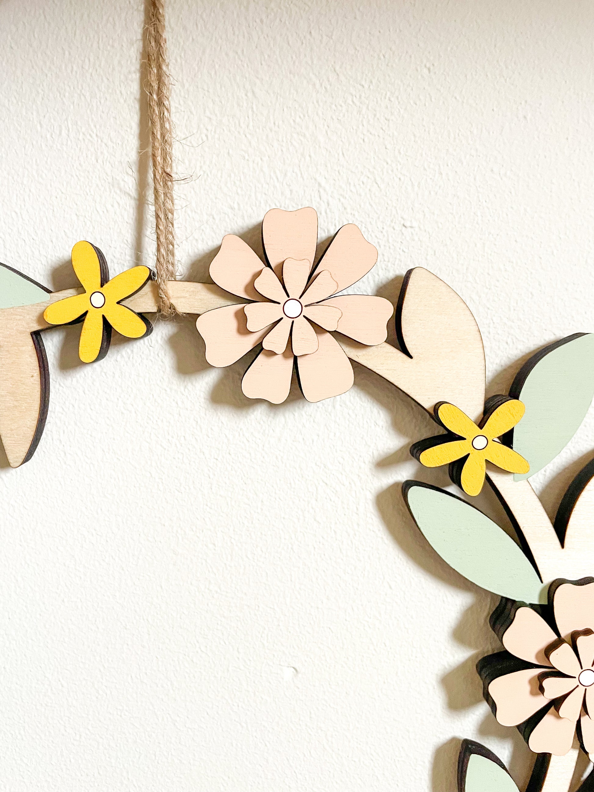 Handmade and hand painted wooden wreath. Flowers and leaves are layered for a 3D look. Soft, pastel colours. Can be hung from a nail, or by the string provided.