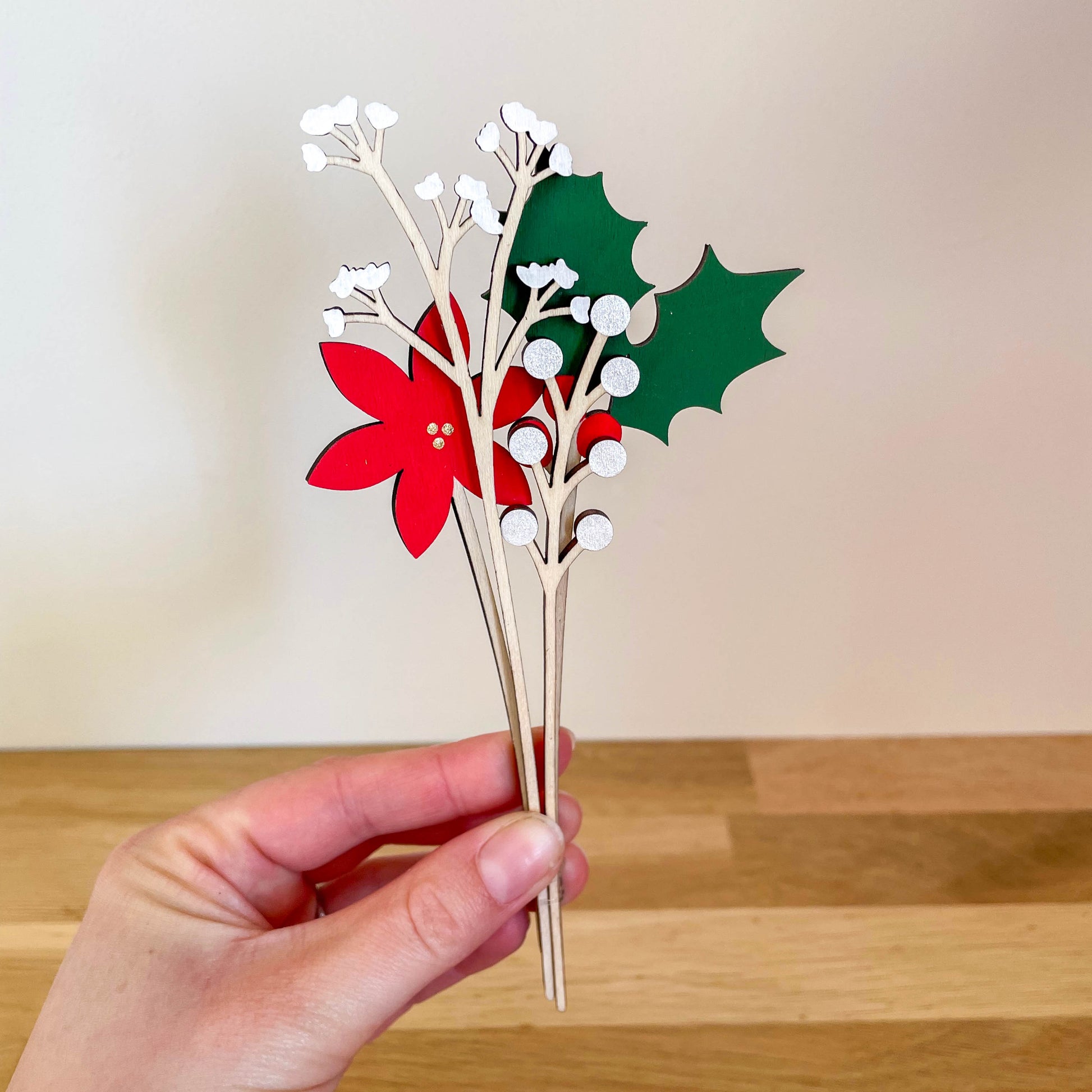 Mini Christmas flower set. Four stems included. All flowers painted on both sides for a lovely display from any angle. These are discounted as an end of line product.