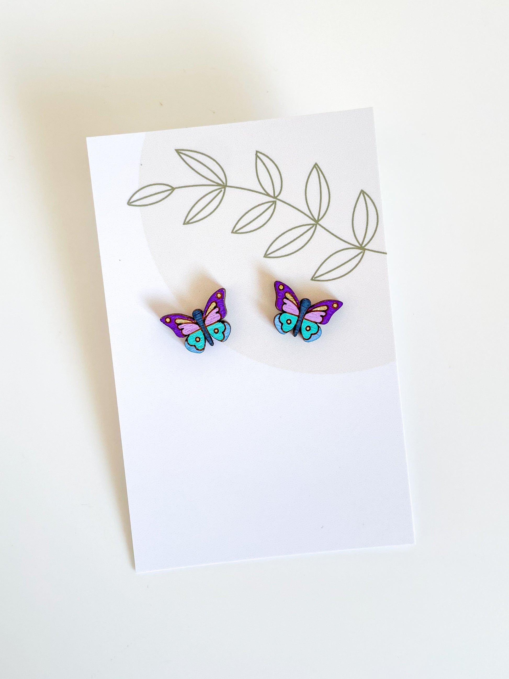 Add a pop of color to your outfit with these colourful Butterfly Stud Earrings. These delicate earrings feature beautiful colours and gold accents and feature sterling silver posts. Each one is handmade and hand painted. Show off your playful side with these quirky and eye-catching earrings.