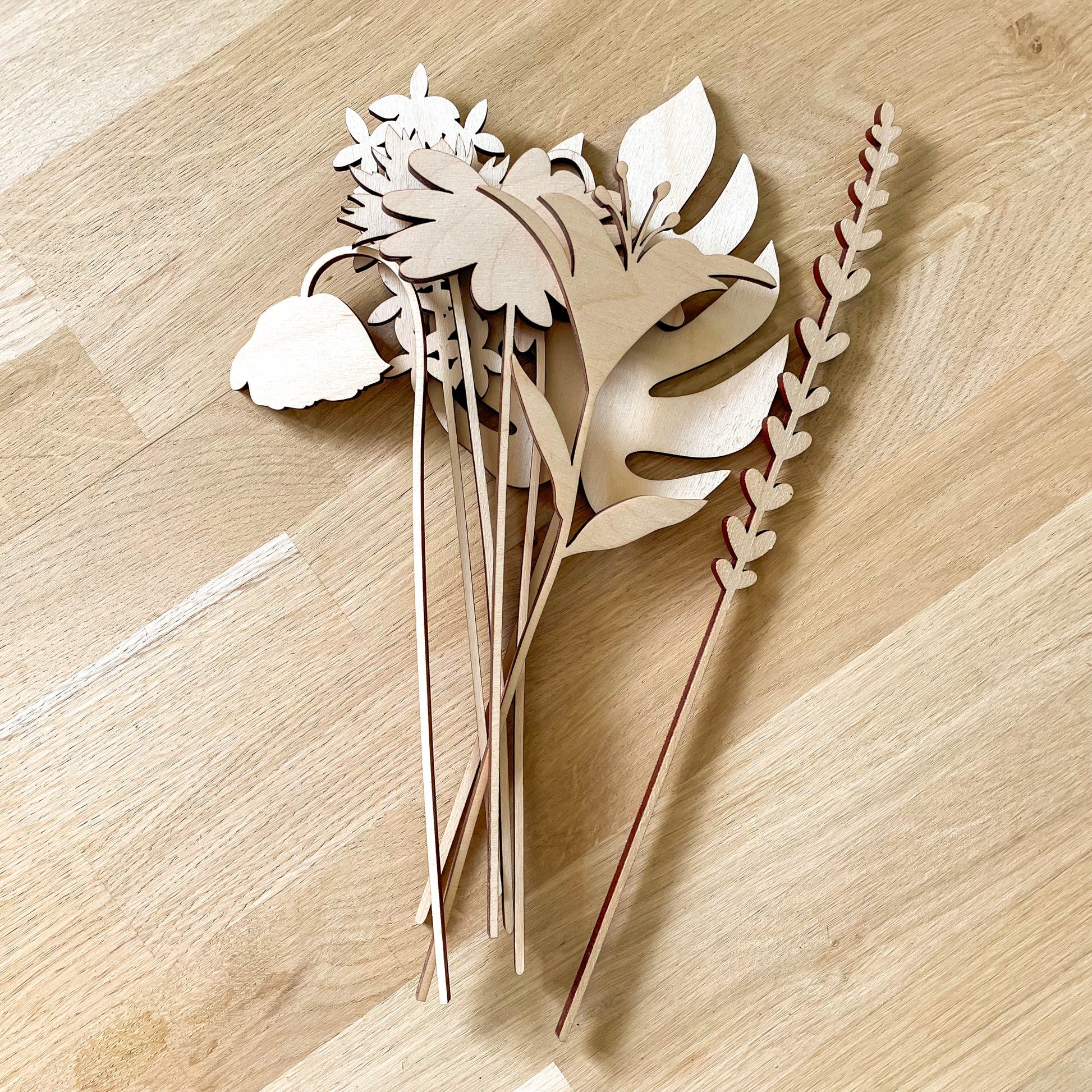 Each stem is laser cut from 4mm sustainable plywood, and measuring between 21.5cm and 29cm tall.