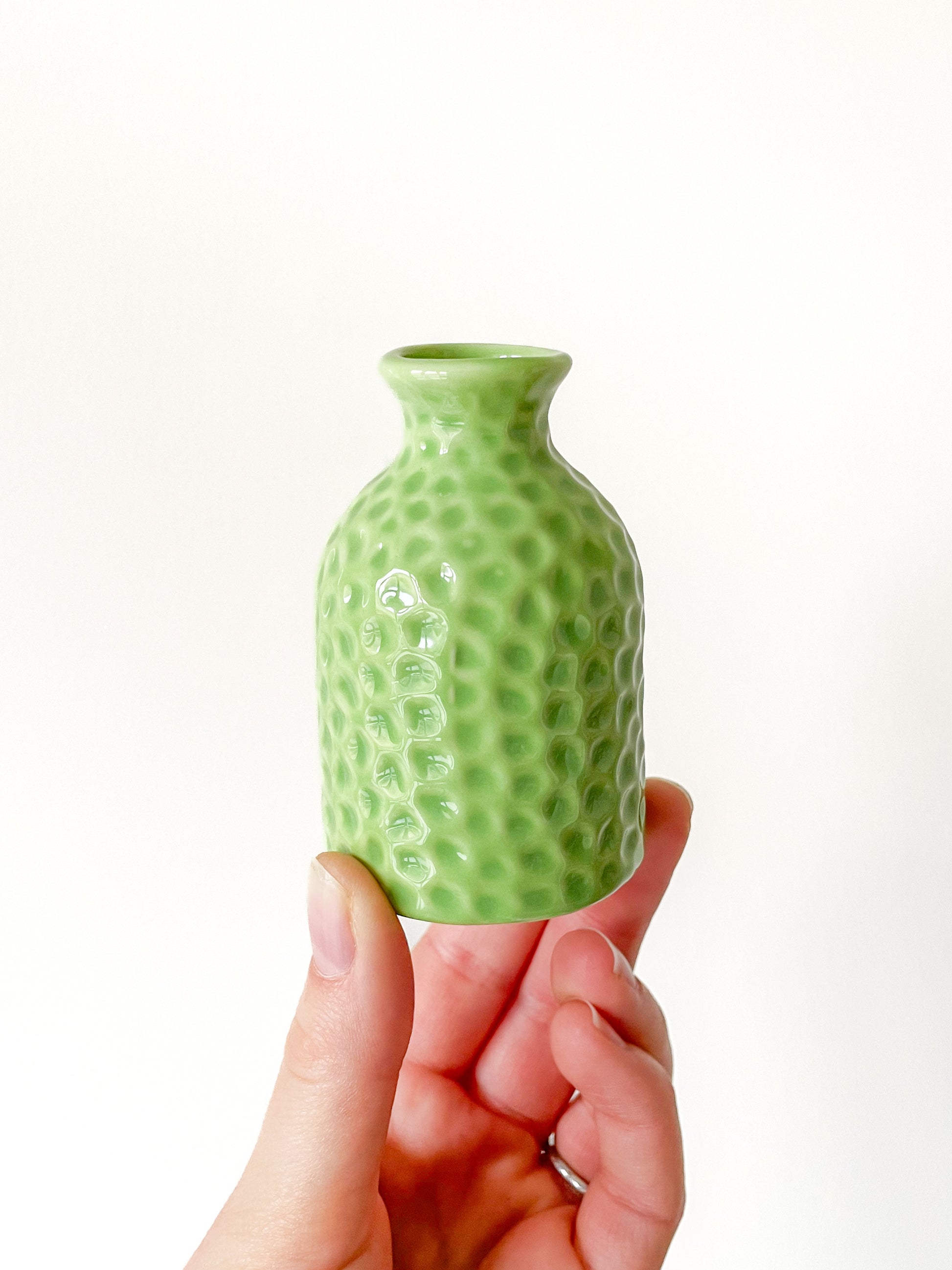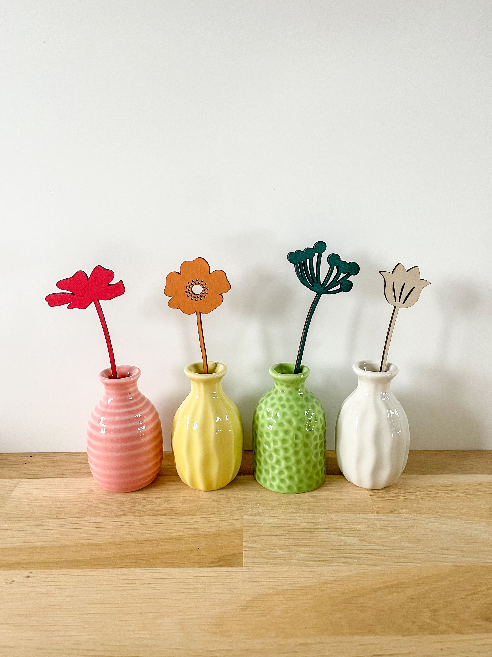 Add a pop of colour to your room with this Mini Ceramic Vase! Available in pink, yellow, green, and white, these 8cm tall vases are perfect for displaying the small wooden flowers. With enough space for four stems, this mini vase is a must-have for any home decor enthusiast.