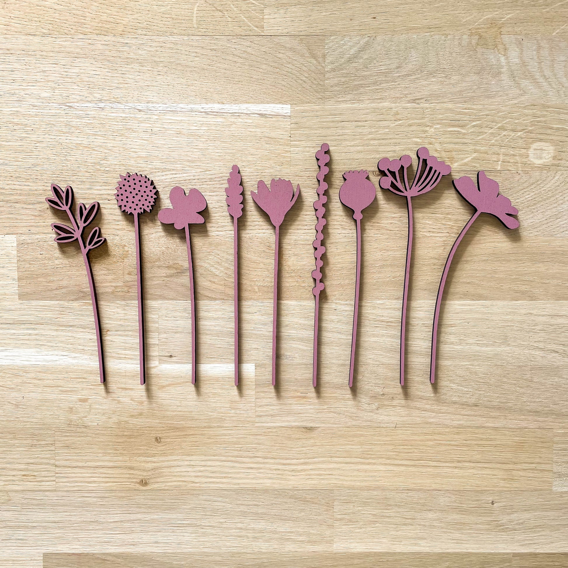 Mini wooden wildflower stems, available to purchase individually to enable you to create your own bespoke bouquet. Laser cut from plywood and hand painted on both sides to ensure a beautiful display from all angles. Available in a range of colourful designs.