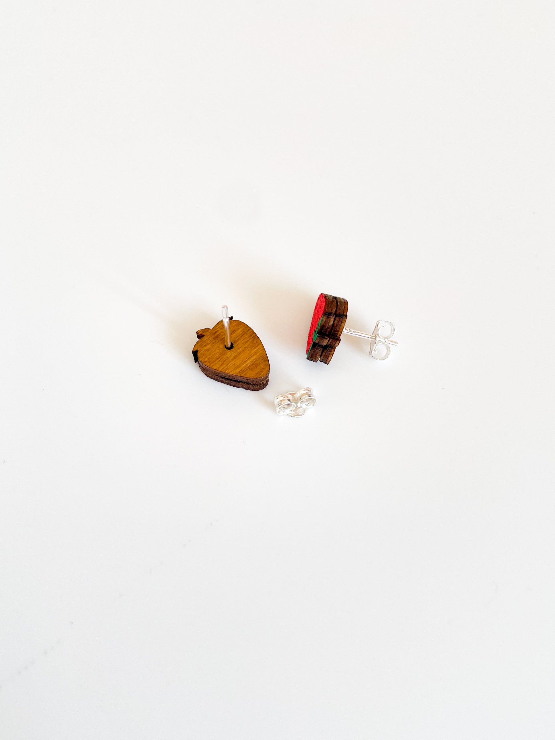 These Strawberry Stud Earrings are handmade from wood, hand painted and feature hypoallergenic sterling silver posts. With a charming strawberry design, these earrings are a sweet and stylish choice.